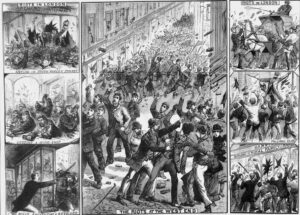 “…the SDF then led them on a march through Pall Mall towards another meeting in Hyde Park, with Burns at the head of the demonstration brandishing an improvised red flag. Provoked by jeering from the rich in their clubs, the demonstrators first responded by throwing stones and breaking the club windows and then set about looting shops in Piccadilly and South Audley Street. It wasn’t until the rioting had reached Oxford Street that the police belatedly intervened. Subsequently the SDF leaders were prosecuted on a charge of seditious conspiracy, but they were acquitted.”